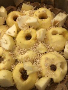Während dein Boden kühlt, kannst du dich um die Äpfel und die Rosinen kümmern. Die Äpfel schälst du am besten so, dass sie ganz bleiben und entkernst sie natürlich noch. Die Rosinen und das Marzipan legst du in etwas Rum in einer separaten Schale ein. Und lässt es dort für einige Minuten ziehen.