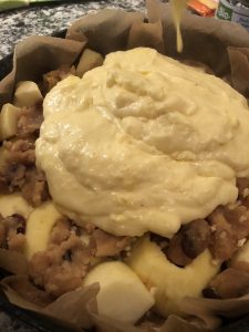 Für die Füllung: 50g Rosinen, Rum, 200g Marzipan, 50g gehakte Mandeln, 6 große Äpfel, 50g Mandelblätter, 50g brauner Zucker, Zimt, 1 1/2 Päckchen Puddinpulver, 500ml Sahne, 1 Packung Schmand, 100g Zucker