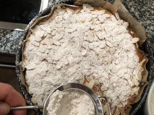 Fast fertig! Dein letzter Schritt besteht daraus, deine Mandelblättchen, den Puderzucker und den braunen Zucker auf den Kuchen zu geben, und den Kuchen dann für weitere 3 Minuten kurz zu backen. Dann schmilzt der Zucker und die Mandelblätter werden kross!