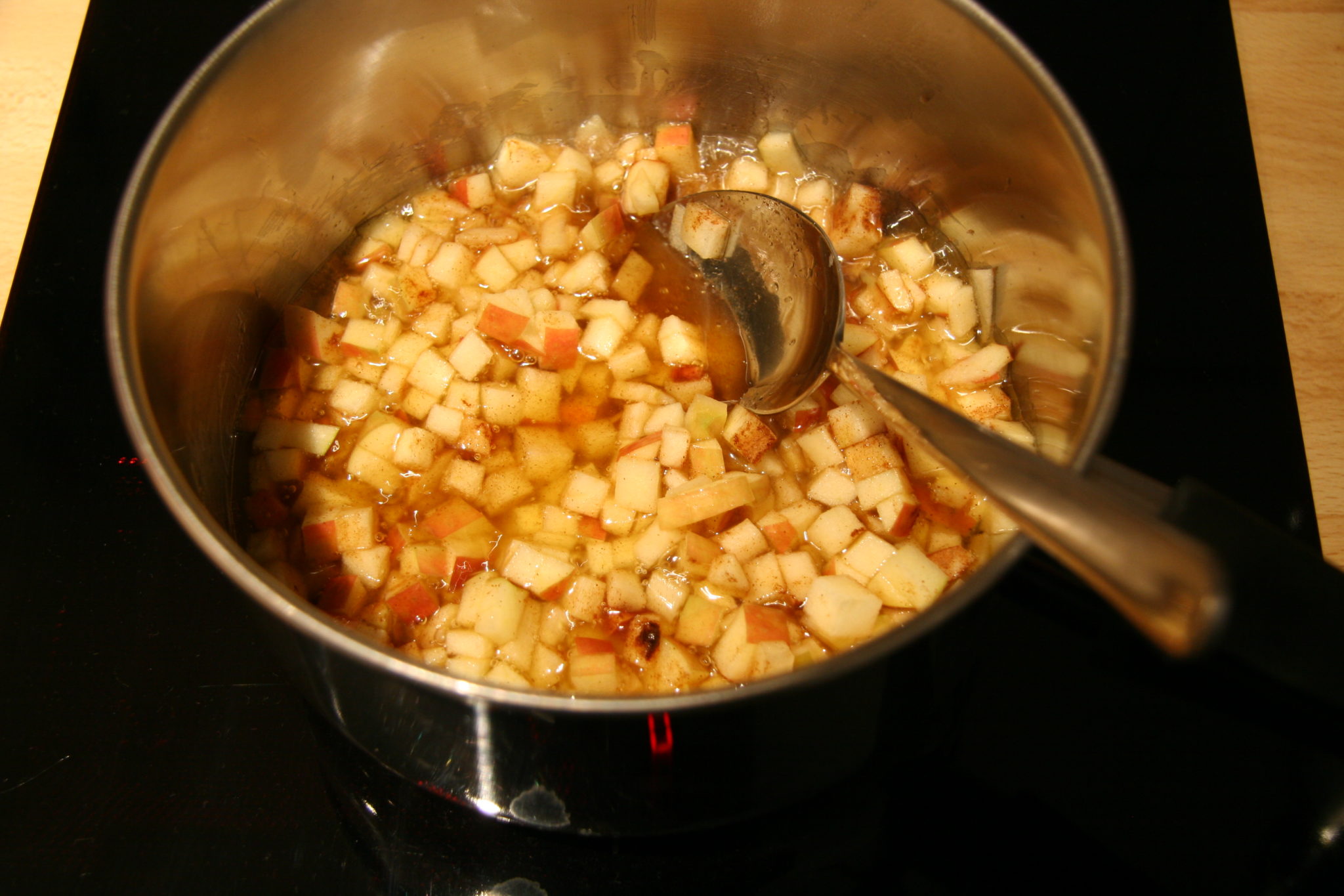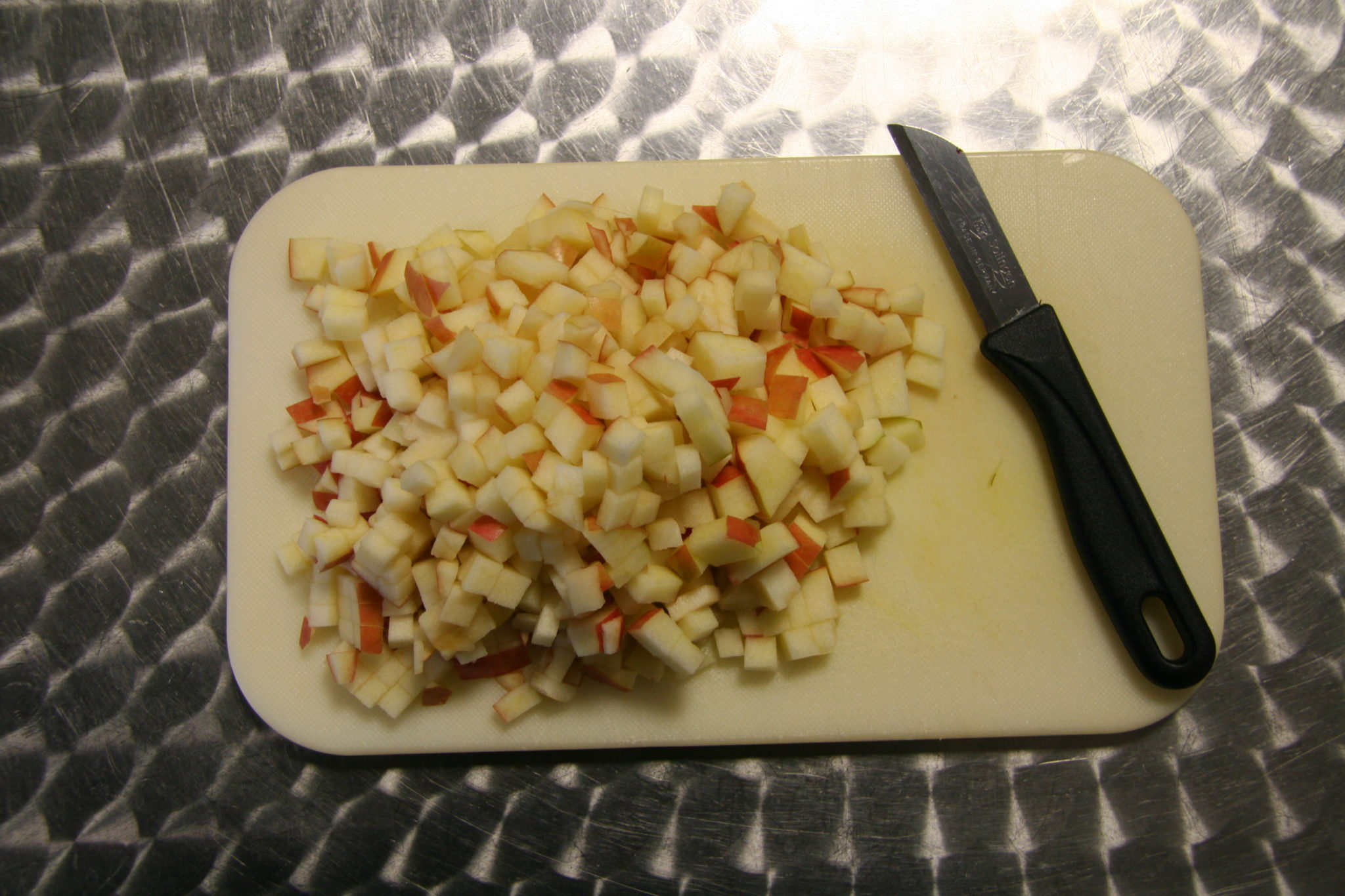 Zuerst müssen die Äpfel mit einem Messer in ganz kleine Stückchen geschnitten werden. Am einfachsten sind natürlich Würfel. Und keine Sorge wegen der Sorgfalt. Die Stückchen müssen definitiv nicht perfekt geschnitten sein!