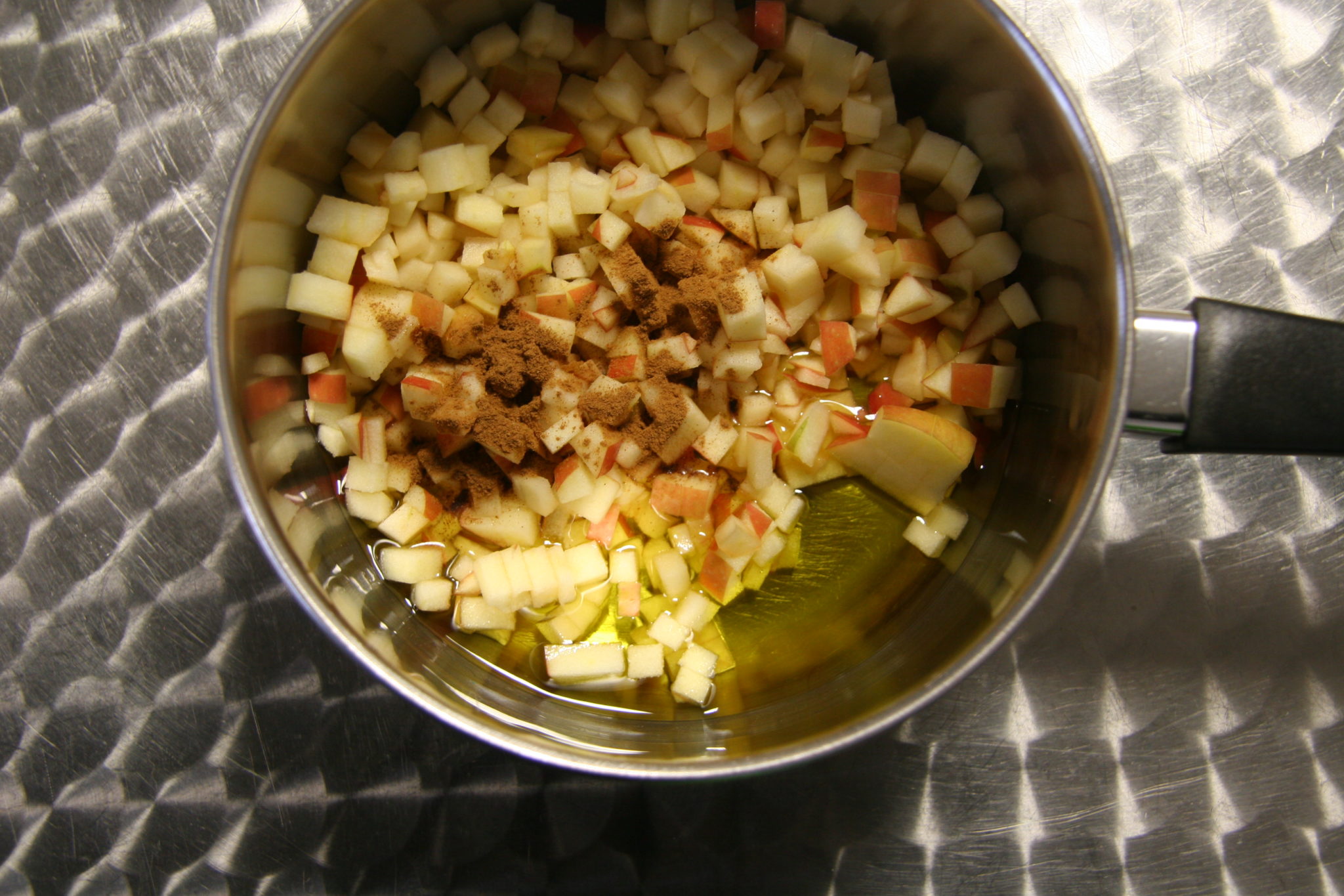Als nächstes misst du 100ml Sonnenblumenöl ab und gibst es zusammen mit den Apfelstückchen und dem Zimt in einen Topf.