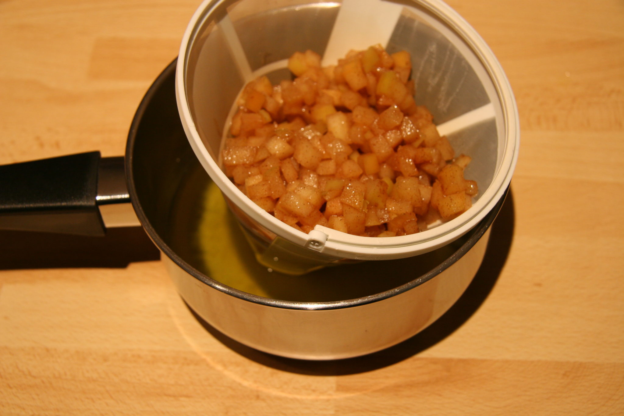 Wenn die 15 Minuten um sind, musst du das Apfel-Zimt-Öl durch das Kaffeesieb, in einen sauberen Topf füllen.