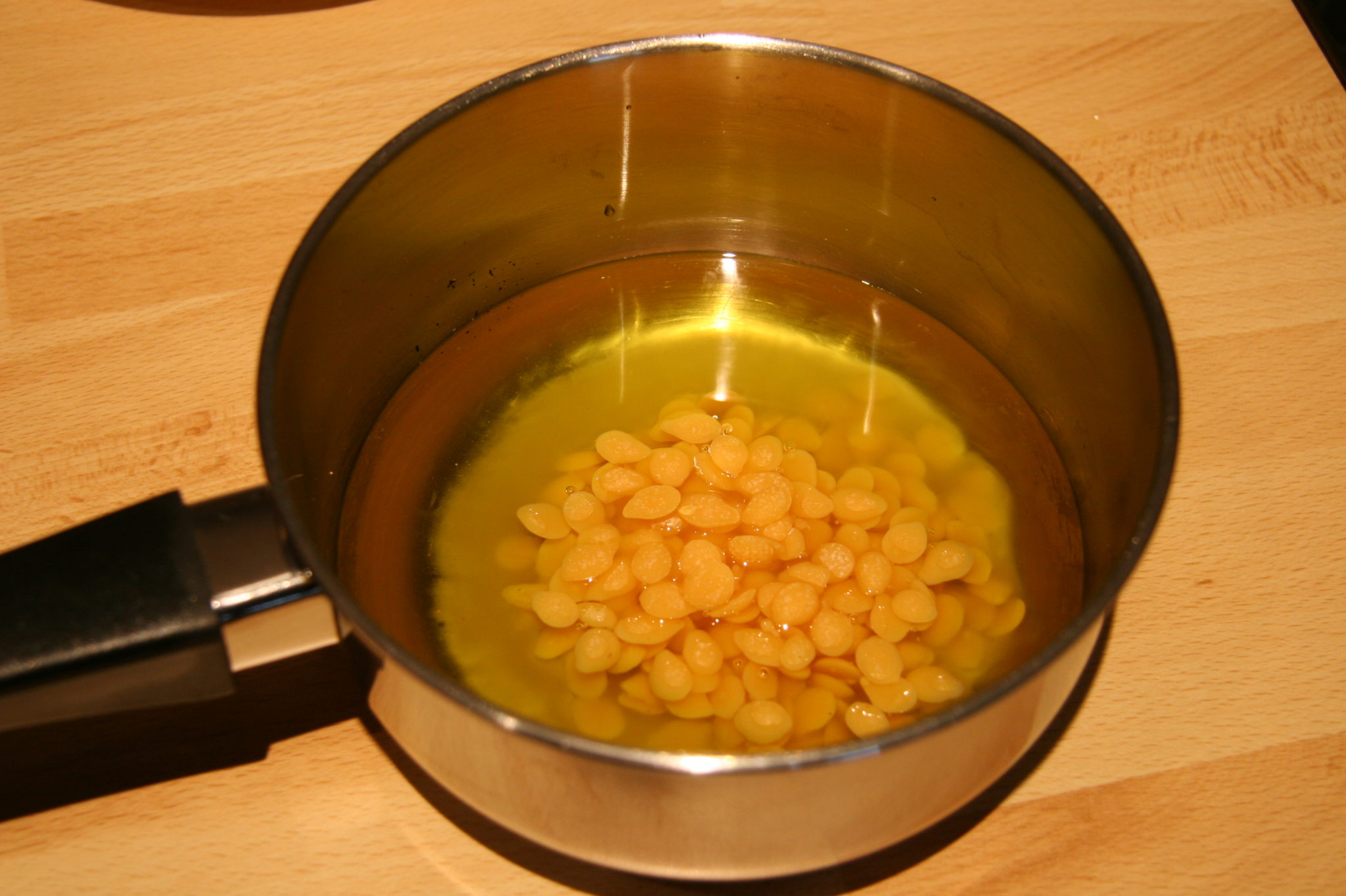 Fast fertig! Nun gibst du zu dem Apfel-Zimt-Öl das Bienenwachs und lässt es bei niedriger Flamme und unter stetigem Rühren schmelzen.