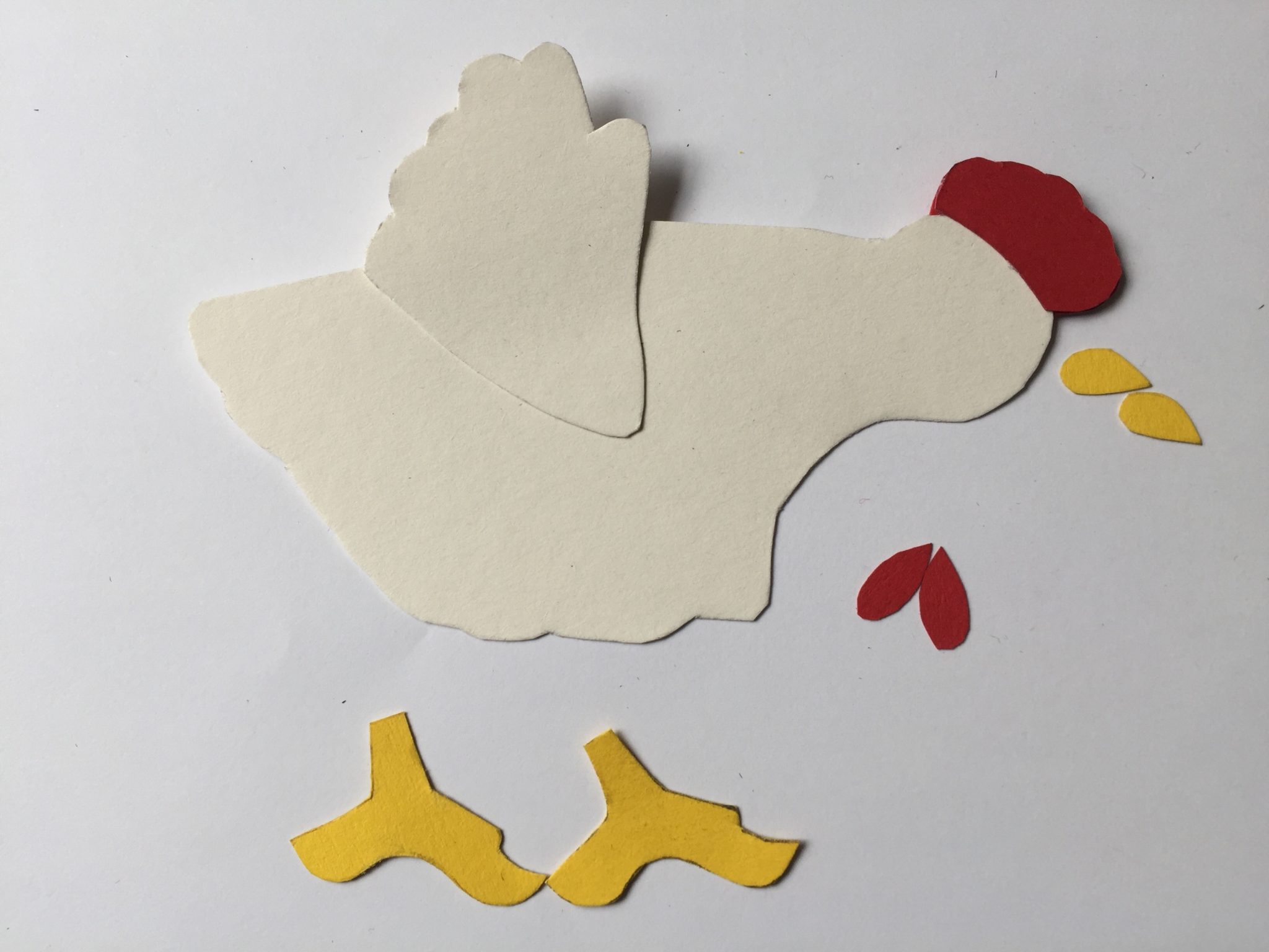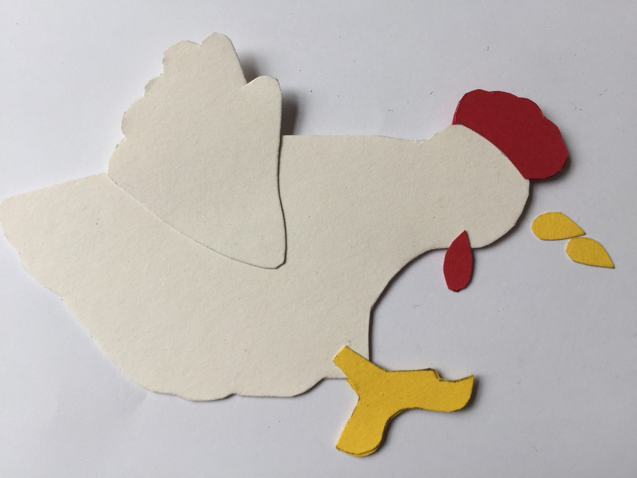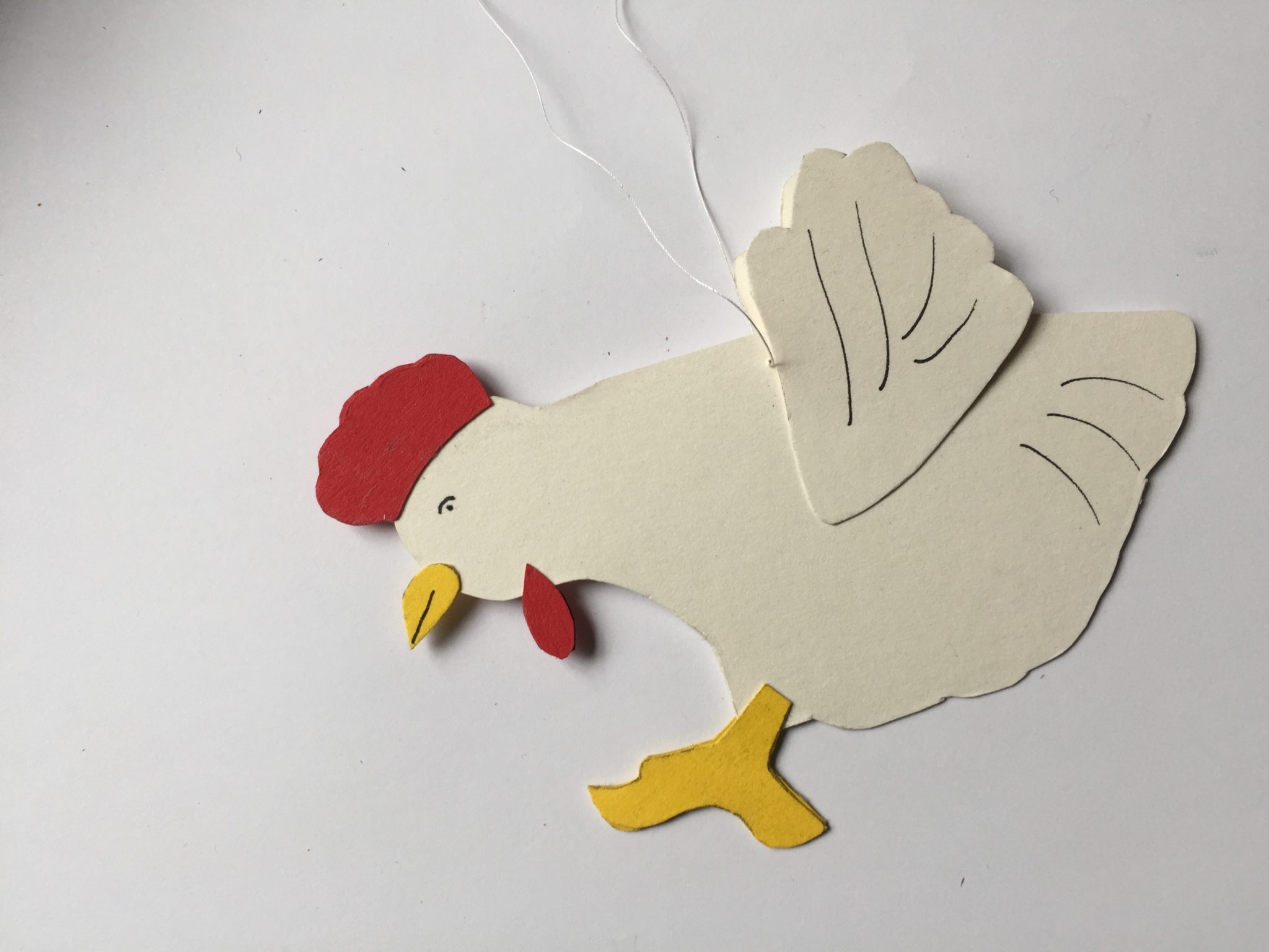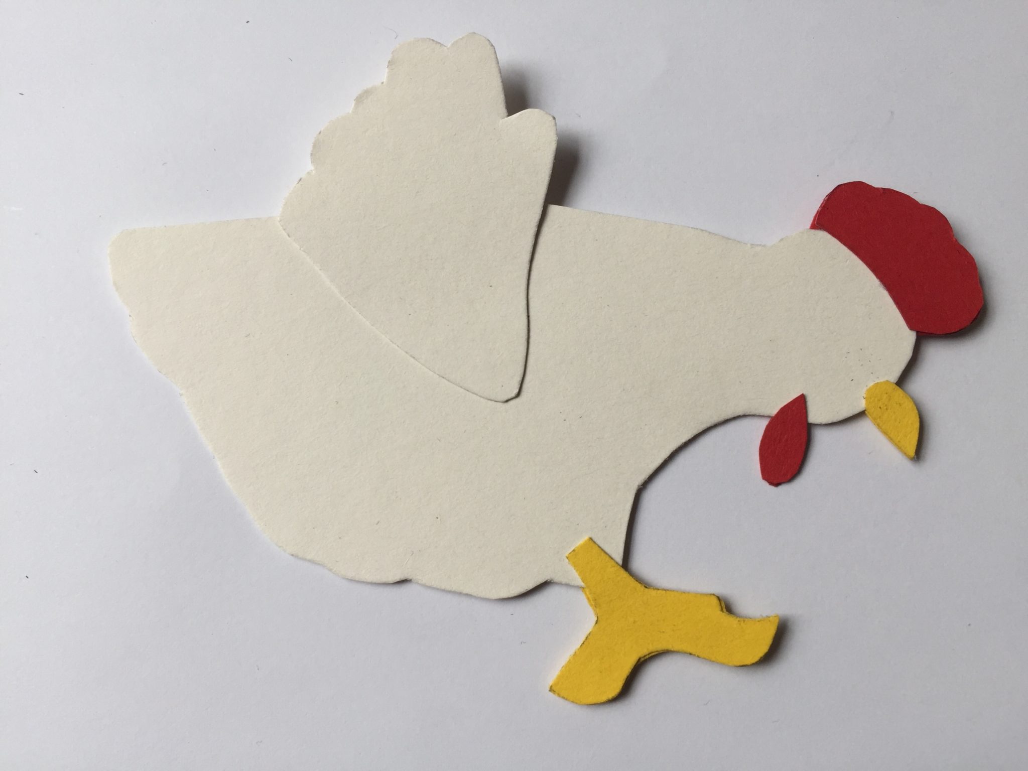 - Tonkarton (bevorzugte Farben: weiß, beige, braun oder schwarz für den Körper, rot für Kamm und Kinn-Gebaumel, gelb für den Schnabel und die Füße). Ganz Mutige unter euch können natürlich auch gemusterten Tonkarton nehmen – sieht bestimmt auch noch witziger aus.