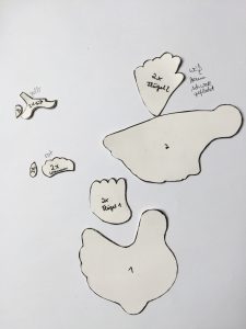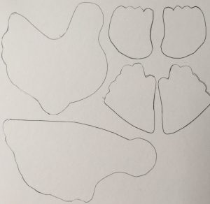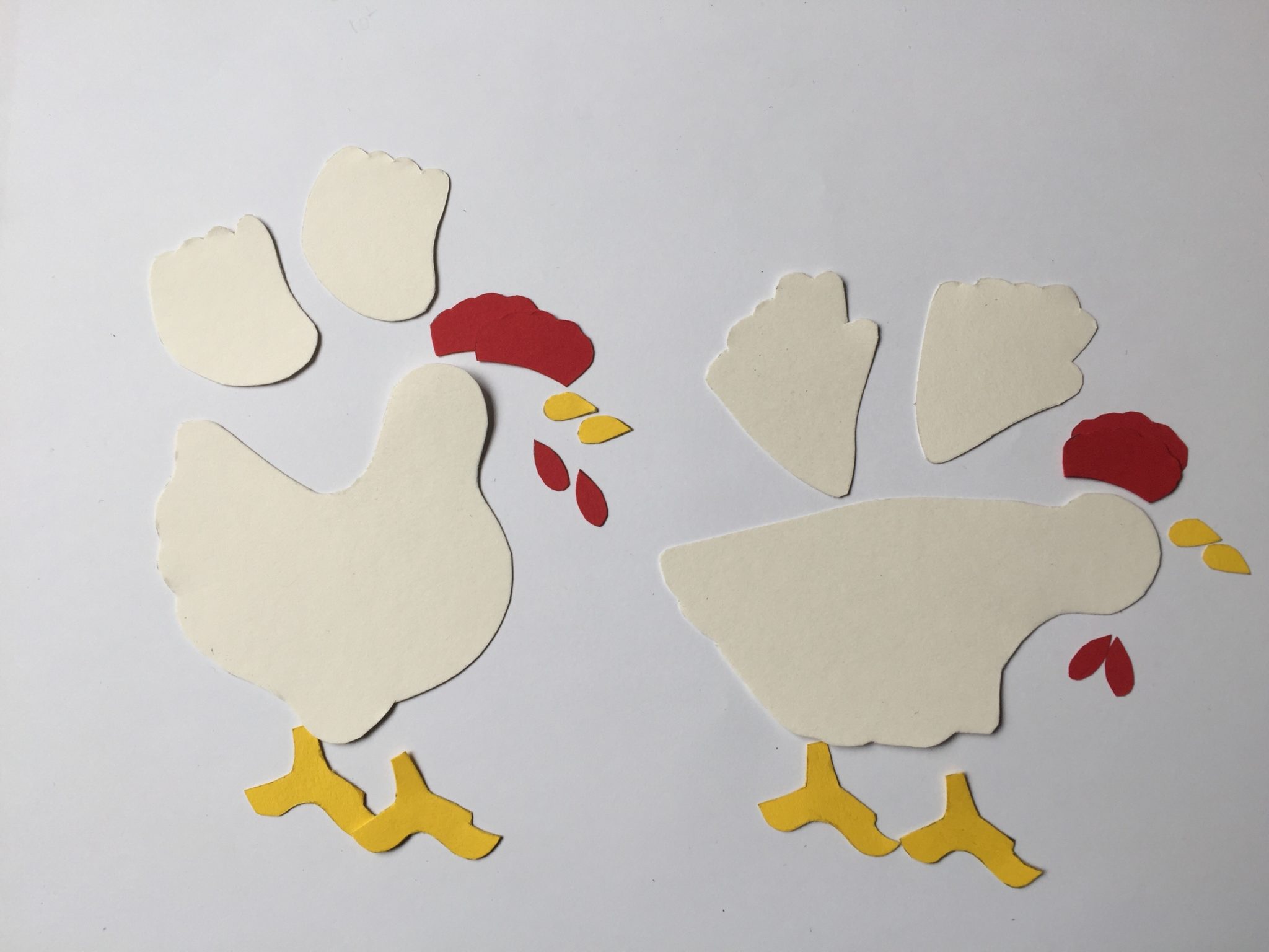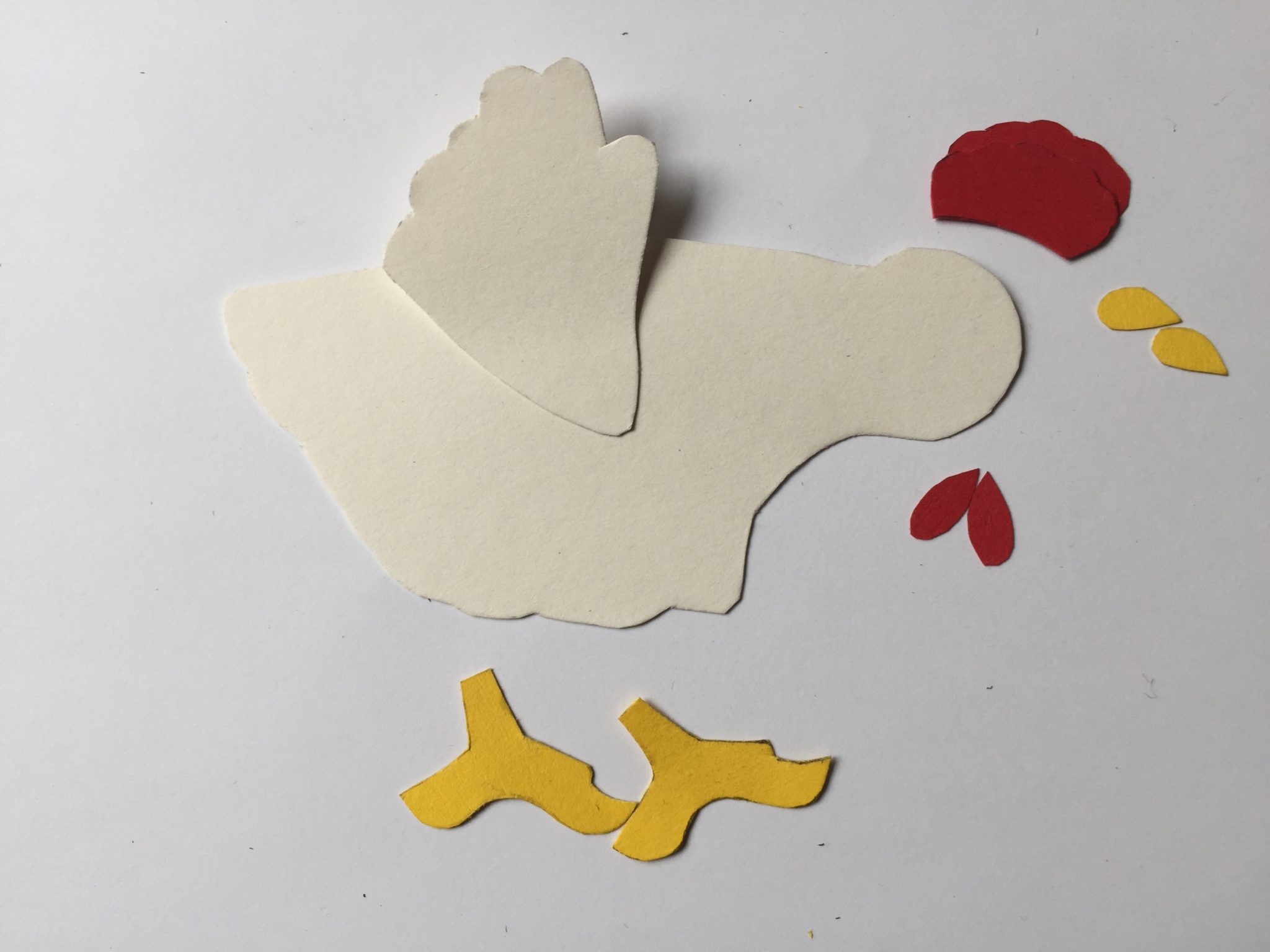 Beide Modelle werden nach dem gleichen Prinzip fertig gestellt. Die Teile des Körpers und der Flügel legt ihr auf weißes, beiges, braunes oder schwarzes Tonpapier und übertragt diese. Die Flügel müsst ihr je zweimal aufzeichnen. Kamm und Kinngebaumel werden auf rotes Tonpapier übertragen und die Füße und den Schnabel auf gelbes. Nun schneidet ihr die Teile sorgfältig aus.