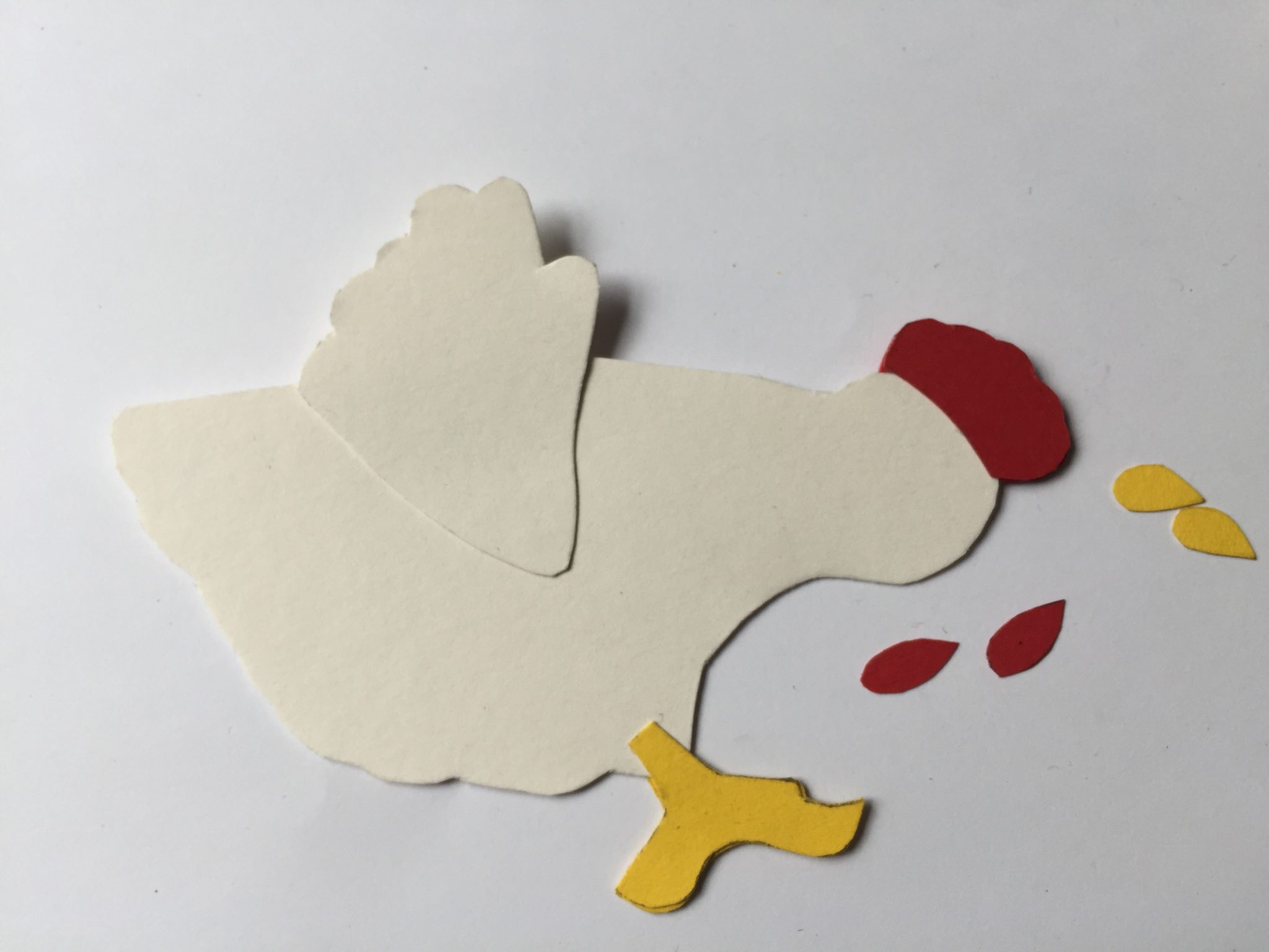 Der Reihe nach klebt ihr die Flügel, Füße, Kamm und Schnabel auf. Dazu klebt ihr erst einen Teil auf die eine Seite, das zweite Teil wird dann anders herum dagegen geklebt.