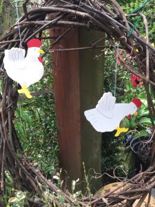 Abschließend malt ihr dem noch „nackten“ Huhn Augen und diverse „Federn“, natürlich von beiden Seiten. Zum Schluß bekommt das Huhn noch einen Aufhängefaden. Dazu fädelt ihr einen Faden in eine Nähnadel und stecht diese zwischen die Flügel ein. Dann verknotet ihr die Fadenenden. Fertig