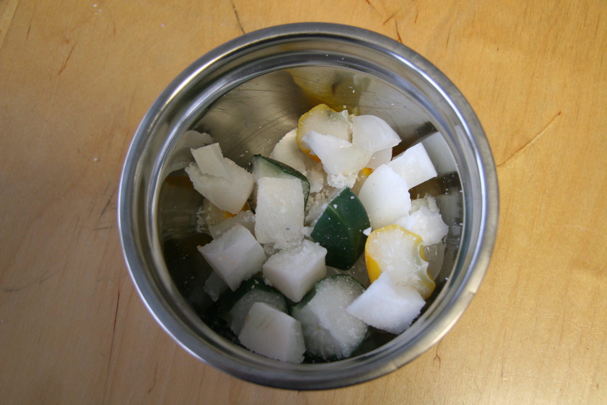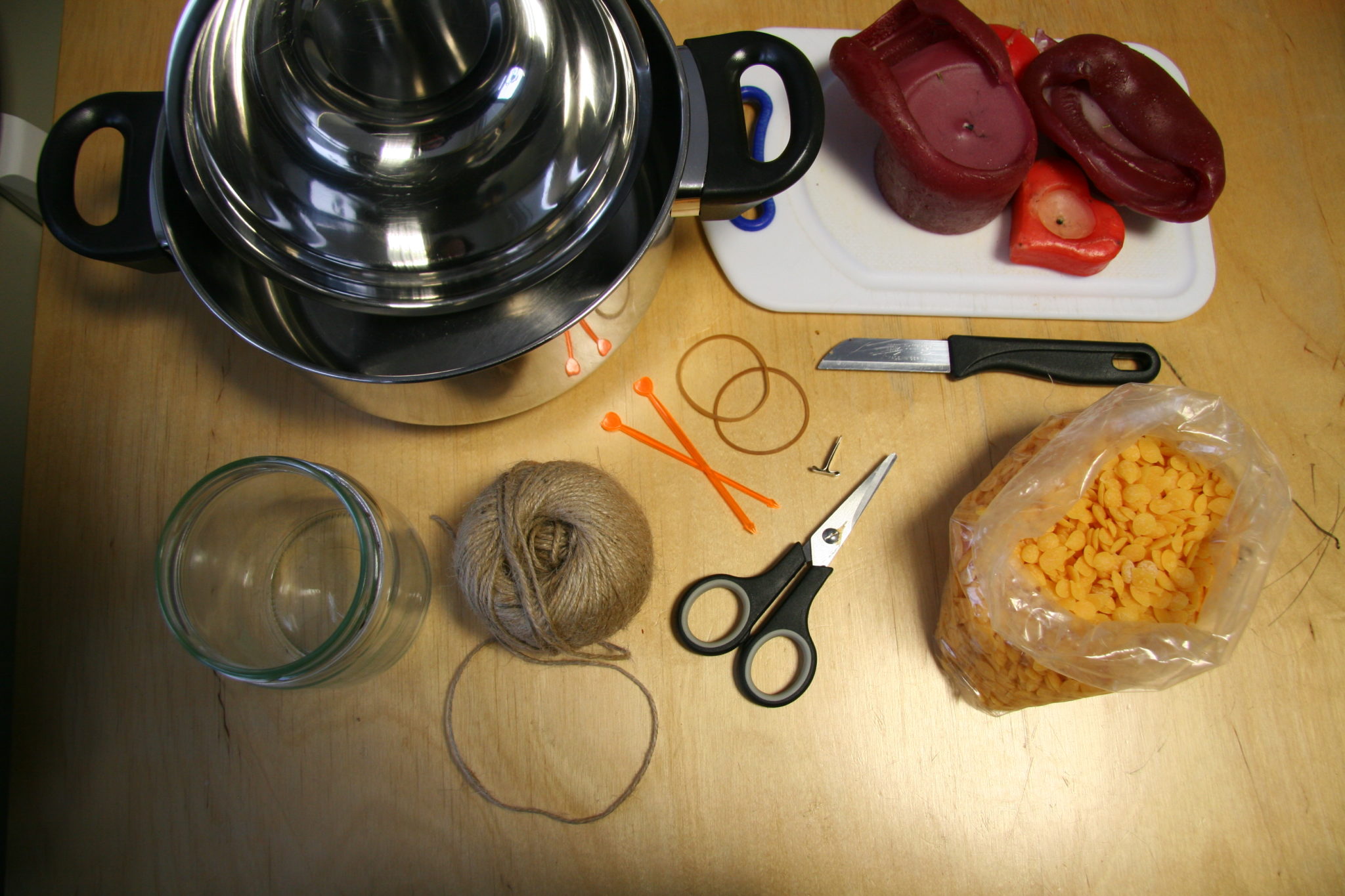 Zu erst zerkleinerst du die Kerzenreste und entfernst die Dochte, wenn du Wachsgranulat benutzt, brauchst du diesen Schritt natürlich nicht machen.