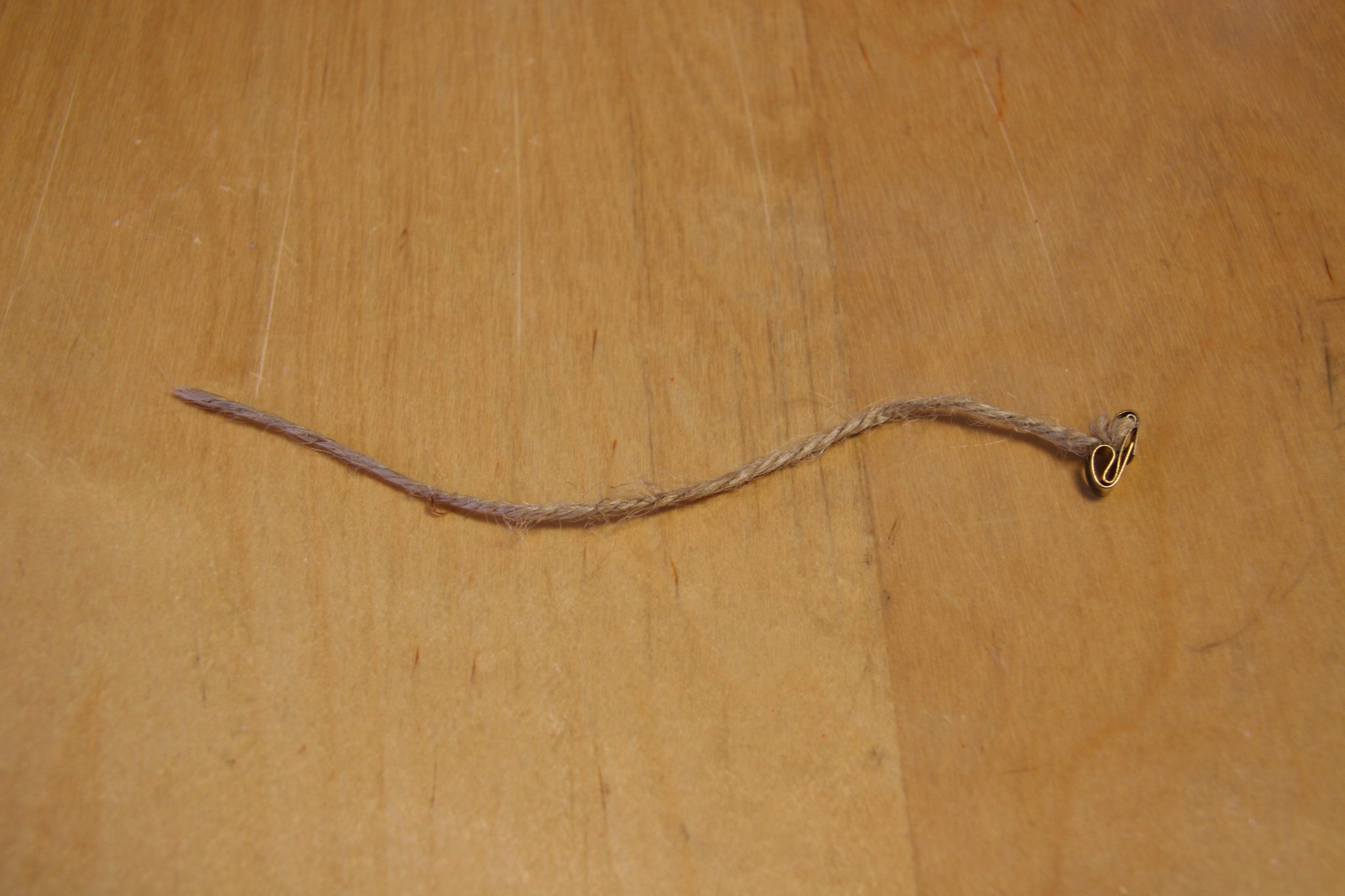 Während das Wachs schmilzt, kannst du schon einmal den Docht für die Kerze basteln. Dafür nimmst du einfach ein Stück Schnur und die Musterbeutel- oder Büroklammer und machst diese am unteren Ende fest. Dann tunkst du die Schnur in den Wachs.