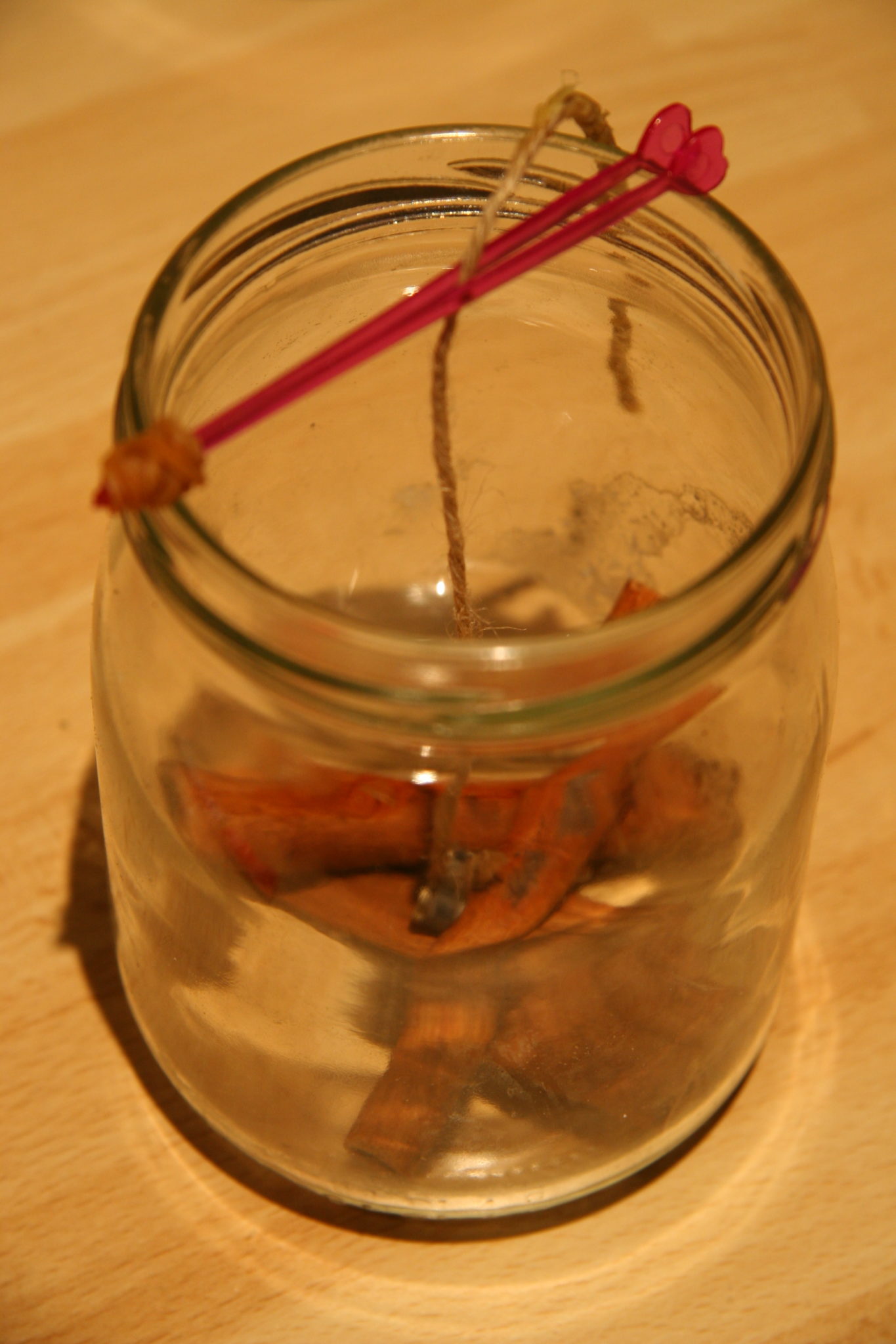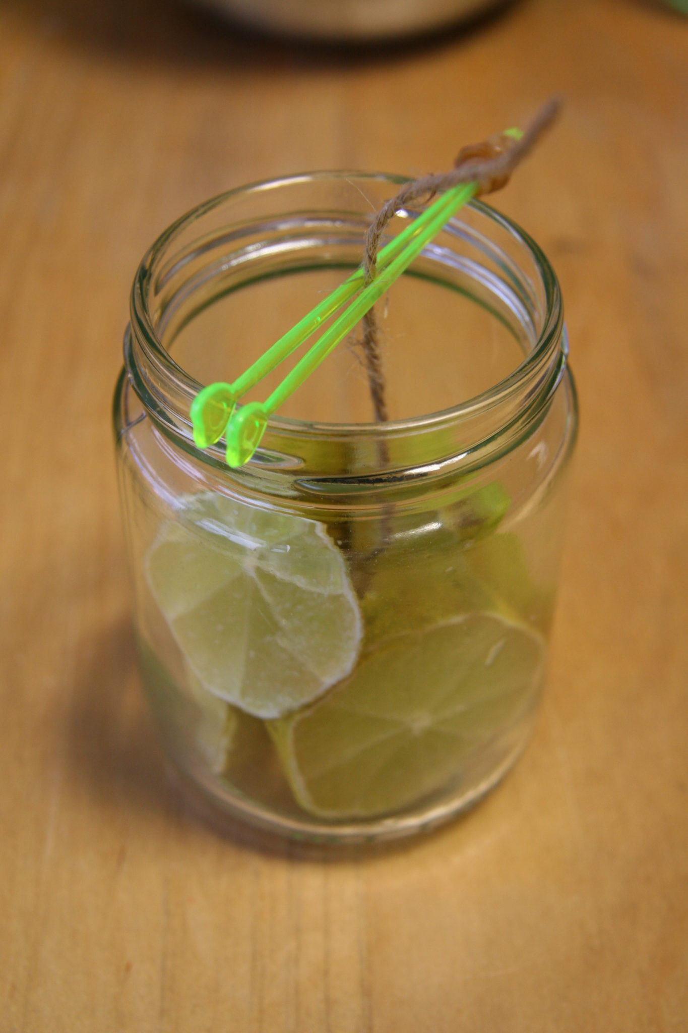 Dann kannst du dein Einmachglas je nach Duft, mit Limettenscheiben, Orangenscheiben, Zimt, Nelken oder Lavendel, dekorieren und den Docht hinzufügen. Damit der Docht hält binde einfach zwei Spieße mit Gummis zusammen und klemme ihn dazwischen.
