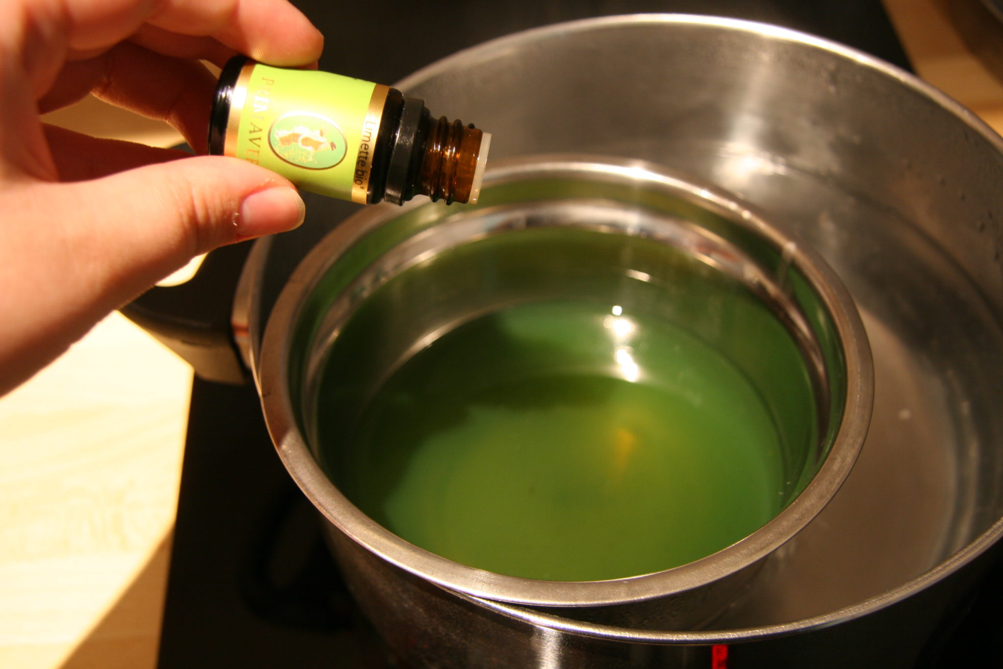 Wenn das Wachs geschmolzen ist, fügst du noch ca. 30 Tropfen des ätherischen Öls hinzu.