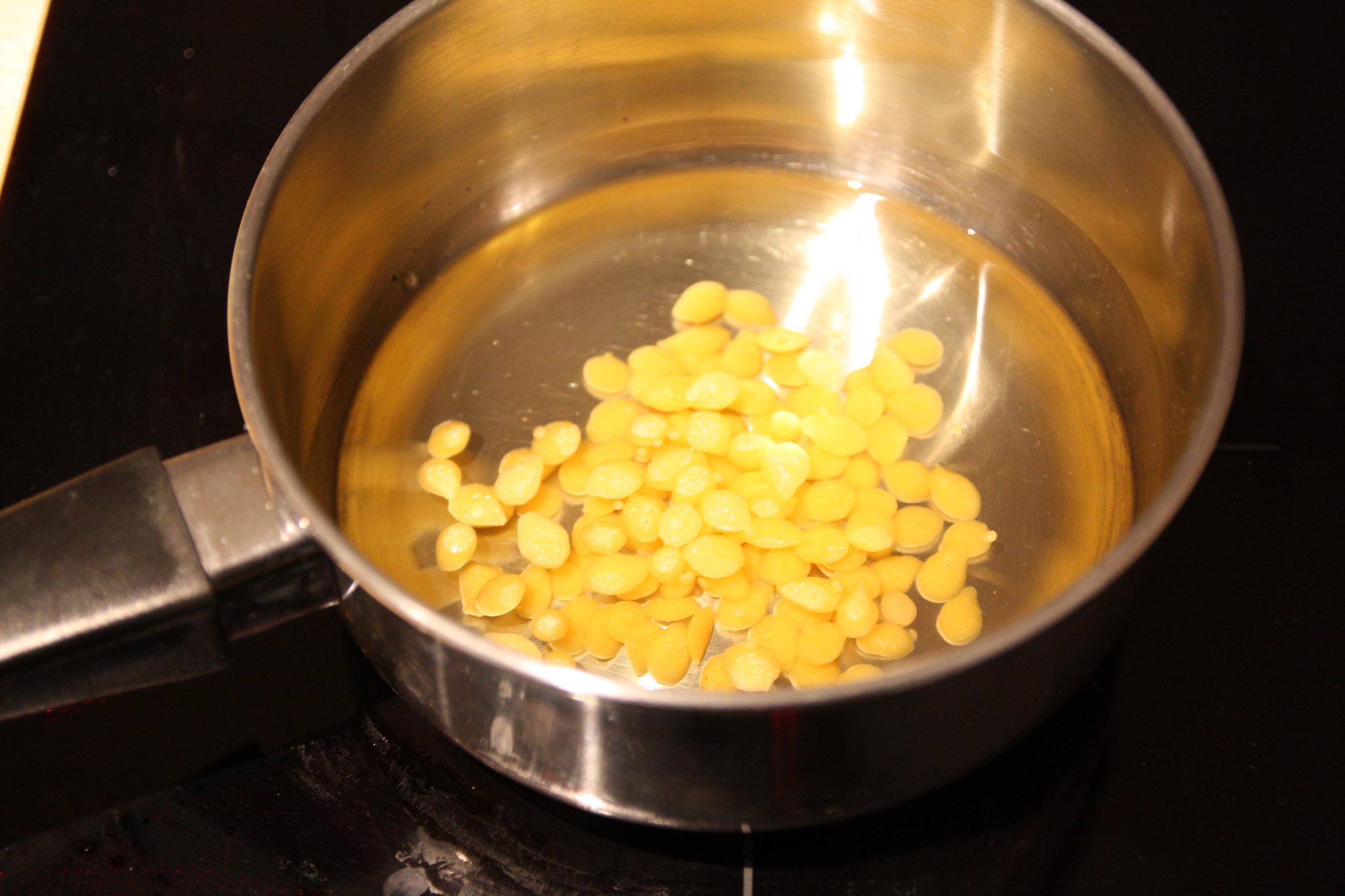 Zuerst gibst du das Öl und den Bienenwachs in den Topf und lässt das Bienenwachs bei niedriger Hitze schmelzen.