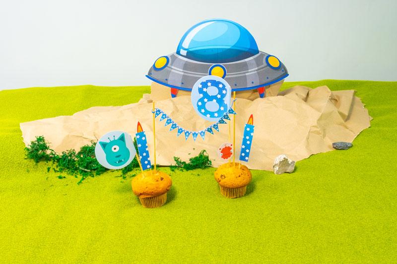 Für kleine Weltraumforscher und Sci-Fi-Fans ist ein Alien-Kuchen genau das Richtige. Mit grünem Fondant, essbarem Glitzer und vielleicht sogar kleinen LED-Lichtern für einen leuchtenden Effekt, wird der Kuchen zum außerirdischen Erlebnis. Ein einfacher Schokoladen- oder Vanillekuchen kann mit grüner Lebensmittelfarbe aufgepeppt und mit Alien-Figuren aus Marzipan oder Fondant dekoriert werden. In unserem Kindergeburtstagsset findest du passende Vorlagen Deko-Elemente, die deinen Alien-Kuchen perfekt ergänzen.